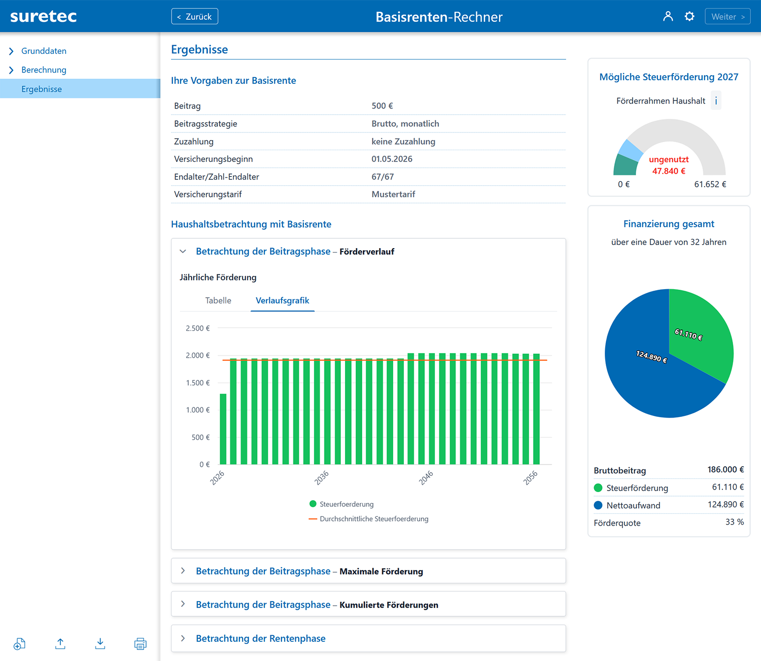 Unser Basisrenten-Rechner ermöglicht die präzise Berechnung kundenindividueller Steuerförderungen für alle Berufsgruppen und unterstützt Sie dabei, Ihre Kunden verständlich, überzeugend und abschlussstark zu beraten.