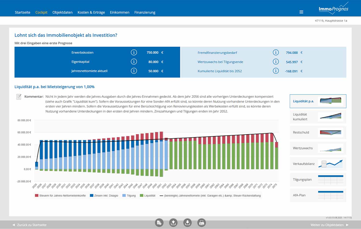 Feststehende Parameter der geplanten Immobilieninvestition (z.B. Objektdaten, Kaufpreis, Jahresnettomiete) können durch begründete Annahmen ergänzt werden. Sie können Beratungskompetenz zeigen, indem Sie z.B. Fragen nach dem Mietausfallrisiko, der künftigen Wertermittlung, der möglichen Mietsteigerung, dem Zinsänderungsrisiko visualisieren und Ihrem Kunden die Effekte aus den Annahmen näherbringen. Als Nebenprodukt können Sie Ihr Beratungsergebnis als Finanzierungsanfrage an unterschiedliche Kreditinstitute senden oder Ihre Marktfolgeabteilung von der Finanzierung überzeugen. Die Darstellung der objektbezogenen Kapitaldienstfähigkeit und der gesamten Kapitaldienstfähigkeit (unter Berücksichtigung aller vorhandenen Einnahmen) finden Sie im Beratungsprotokoll.